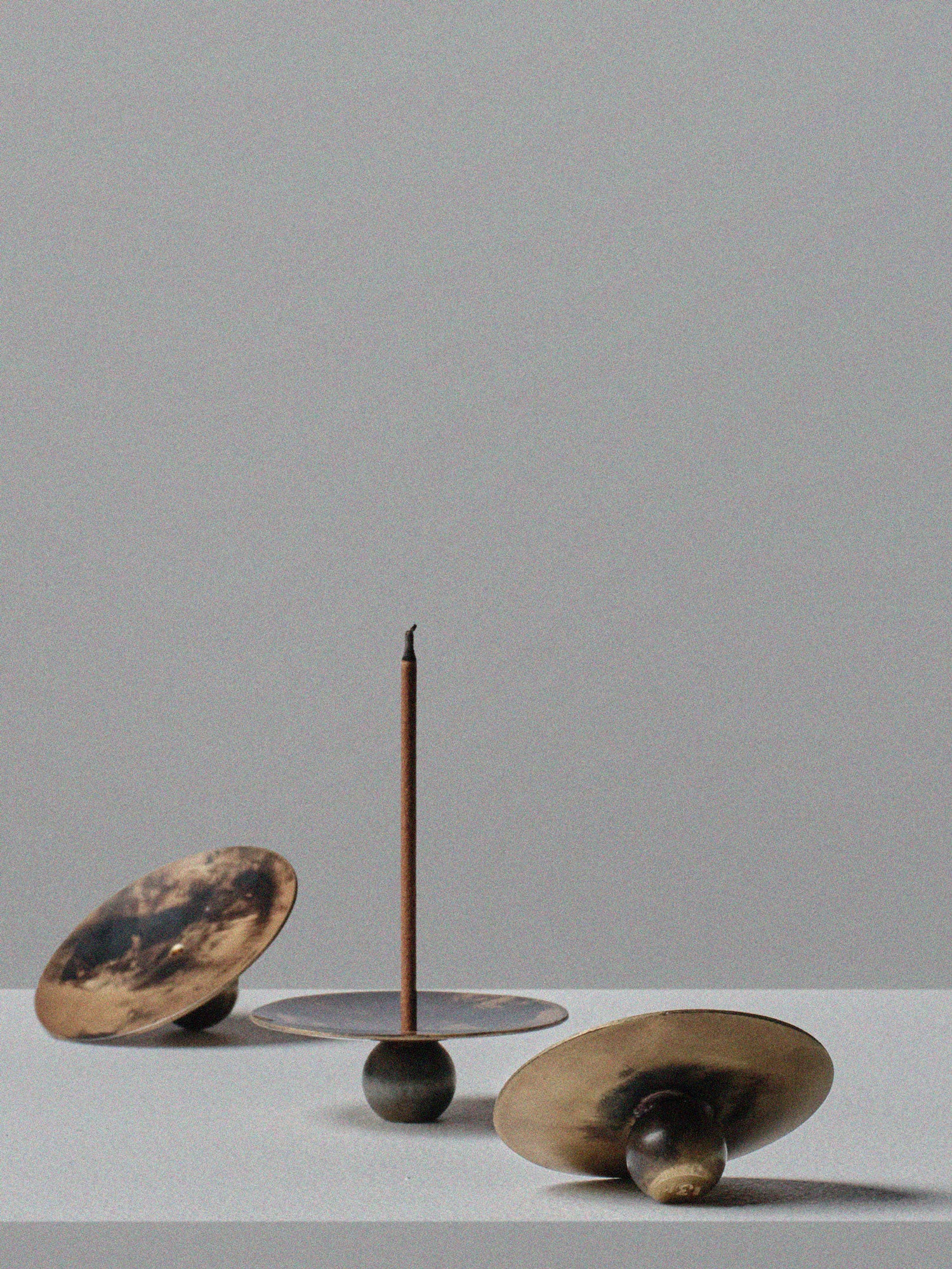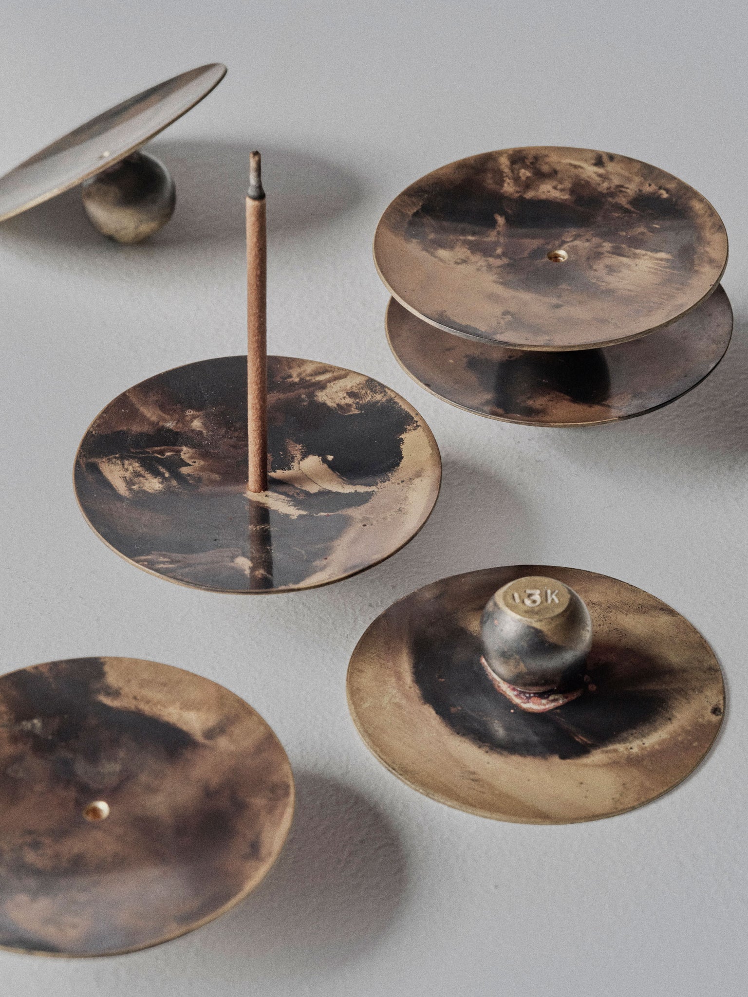 Collection of handmade brass incense burners by 13 Knives with 3mm incense holes and natural flame patina, displayed in a studio detail image