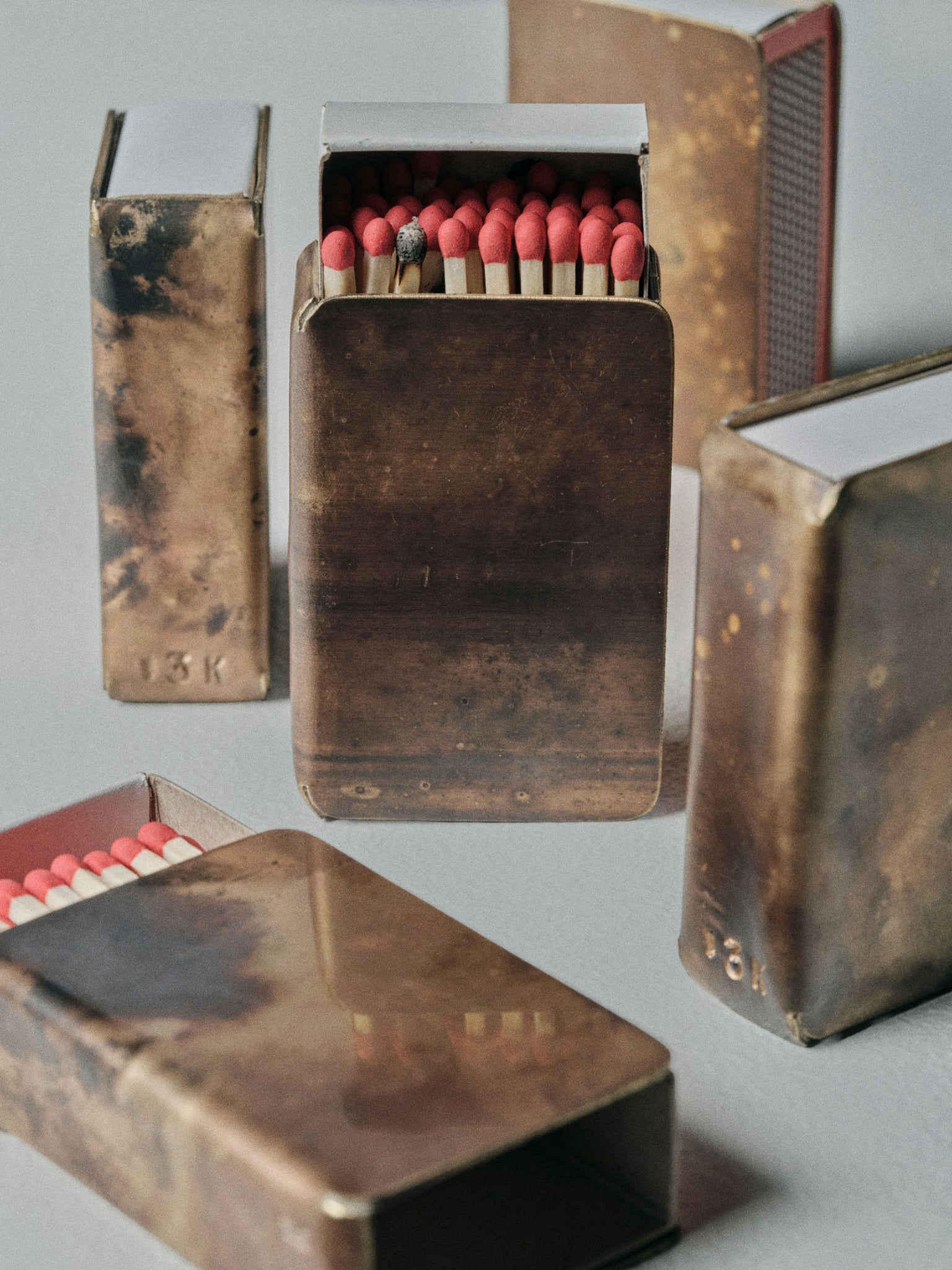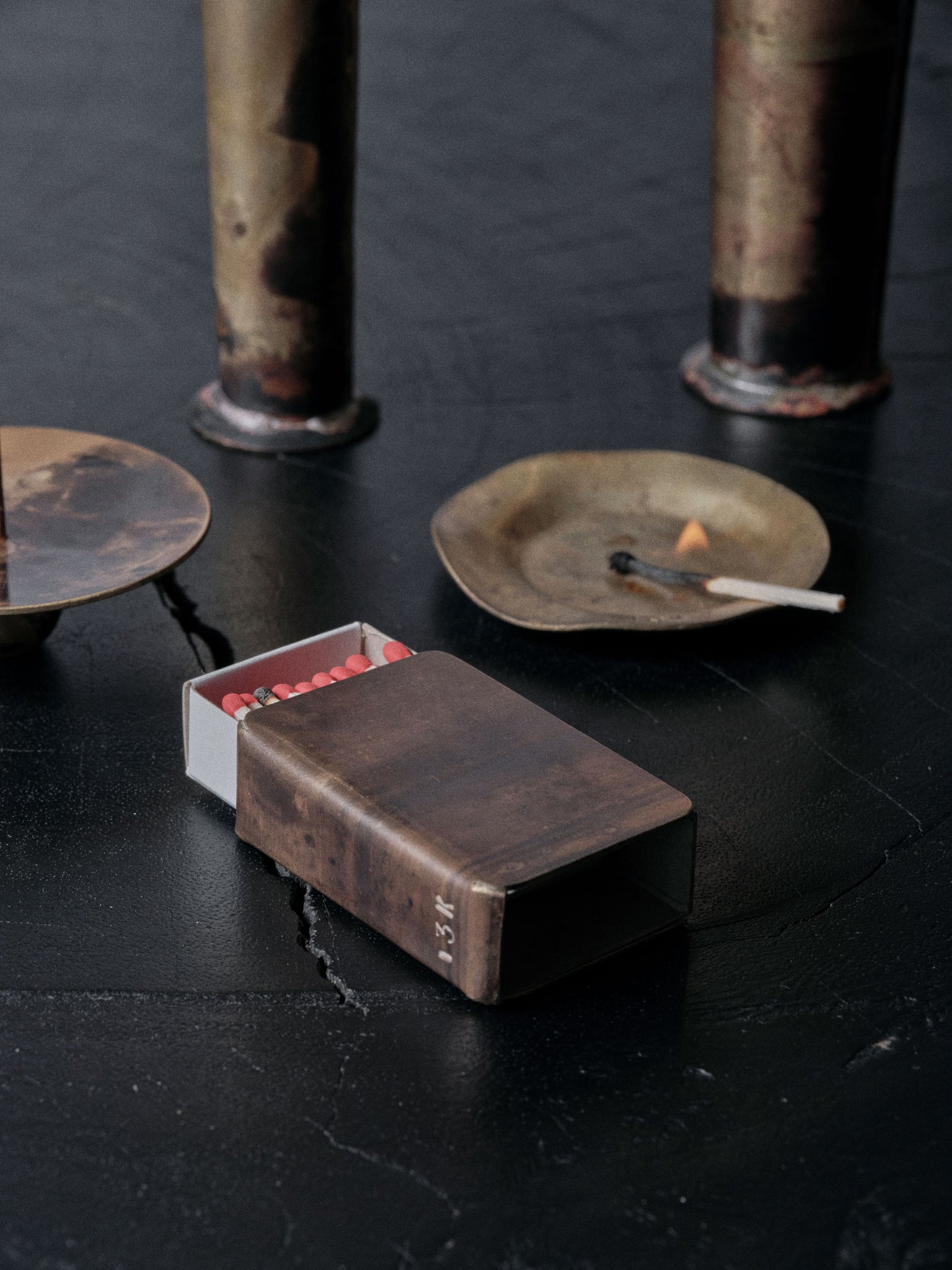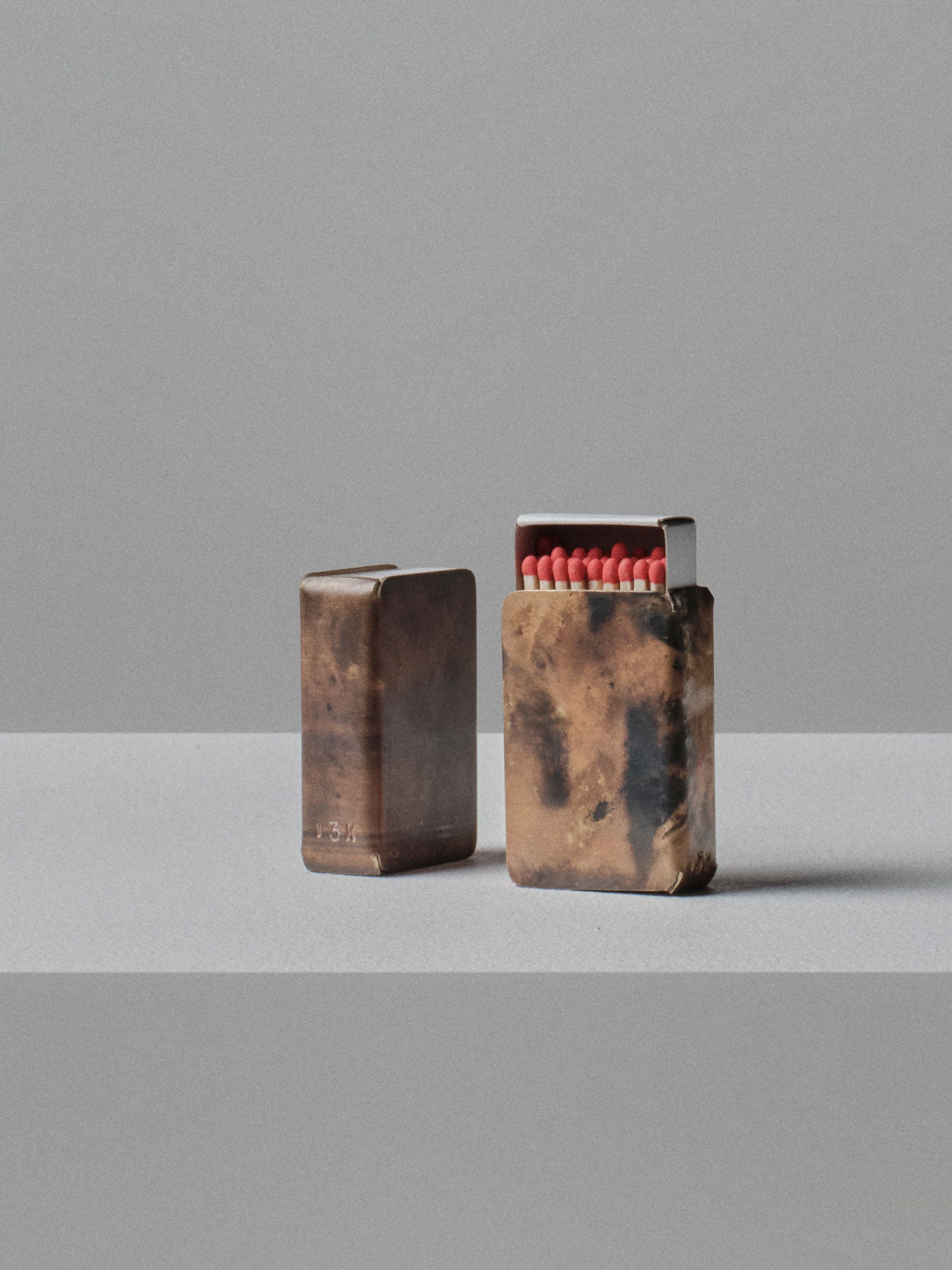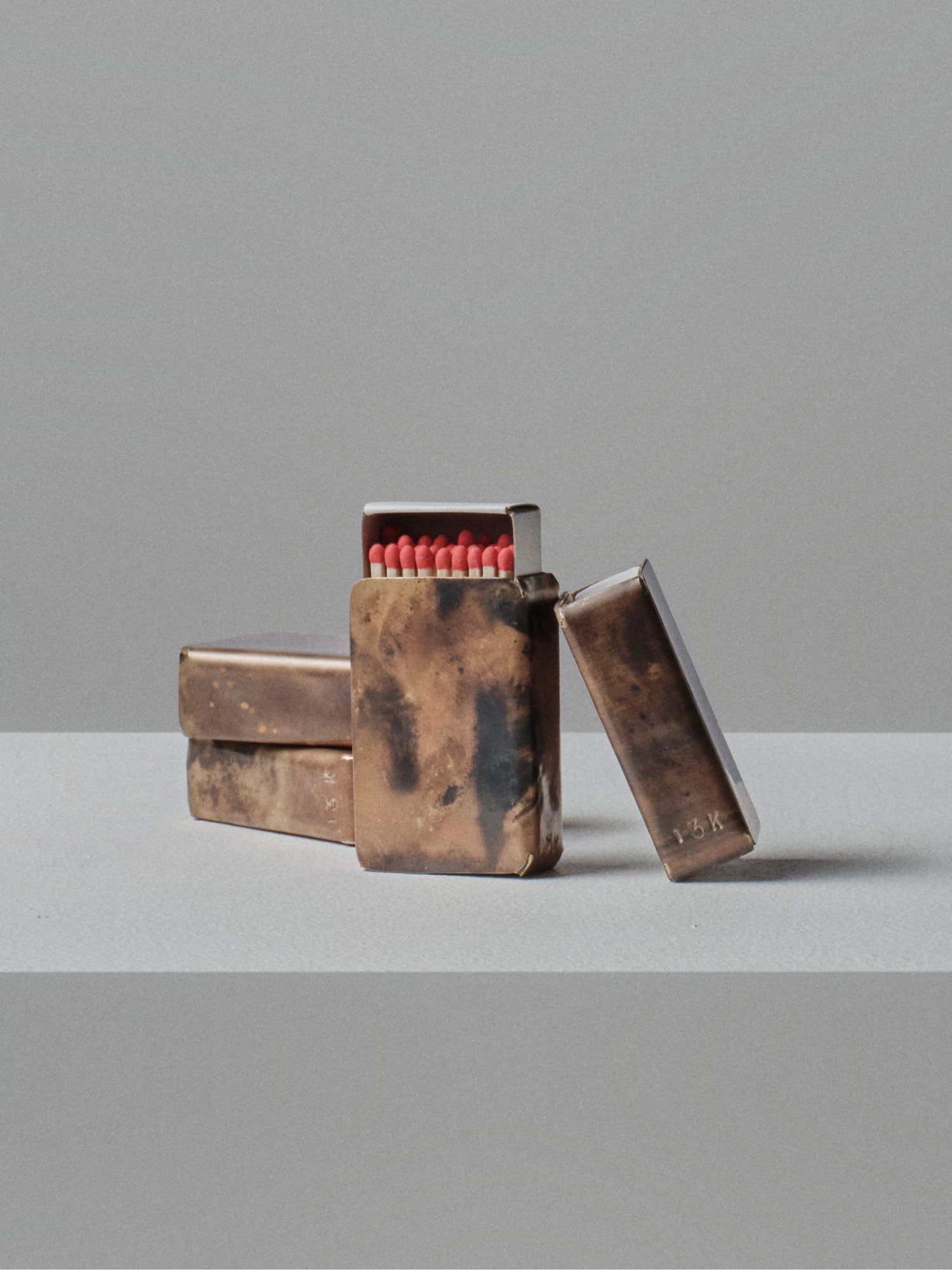 Hand-forged from solid brass, this matchbox cover leaves the striker exposed and ready to go. Built to fit the Classic Redheads 45-pack. It feels good in the hand, even better in the pocket, and belongs on every coffee table.
